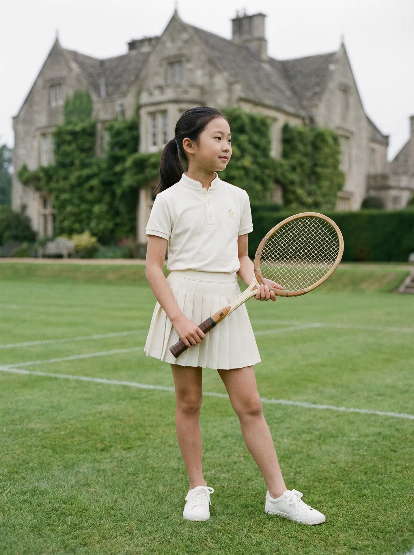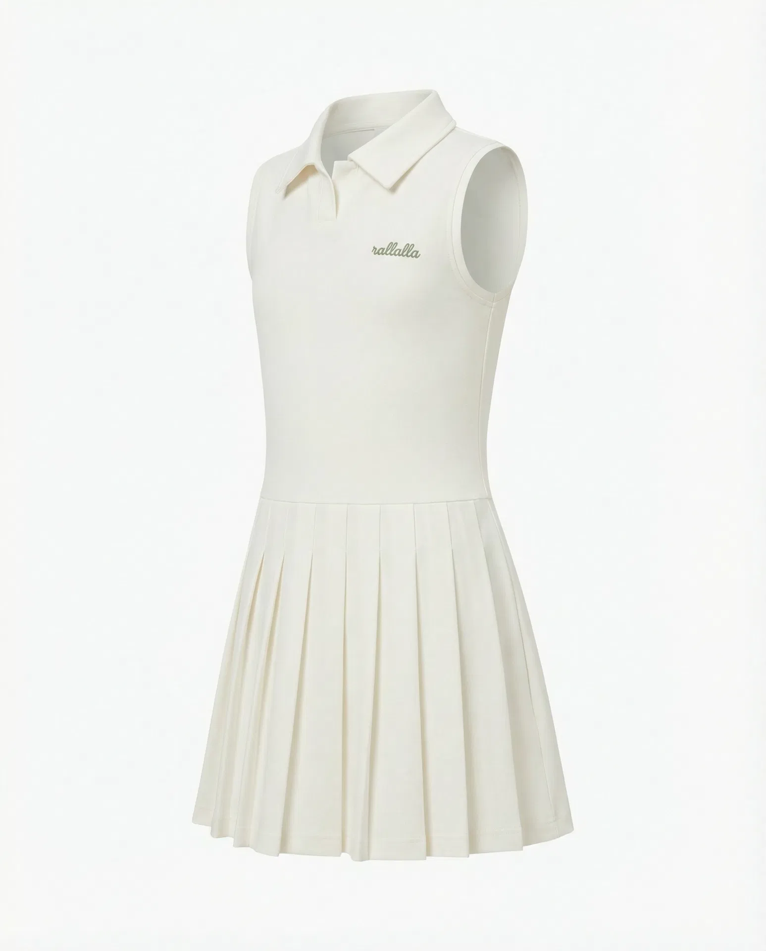 The classic polo collar meets the pleated skirt in ivory white. Clean, timeless, unmistakably rallalla. Sage green logo embroidery adds a signature touch.