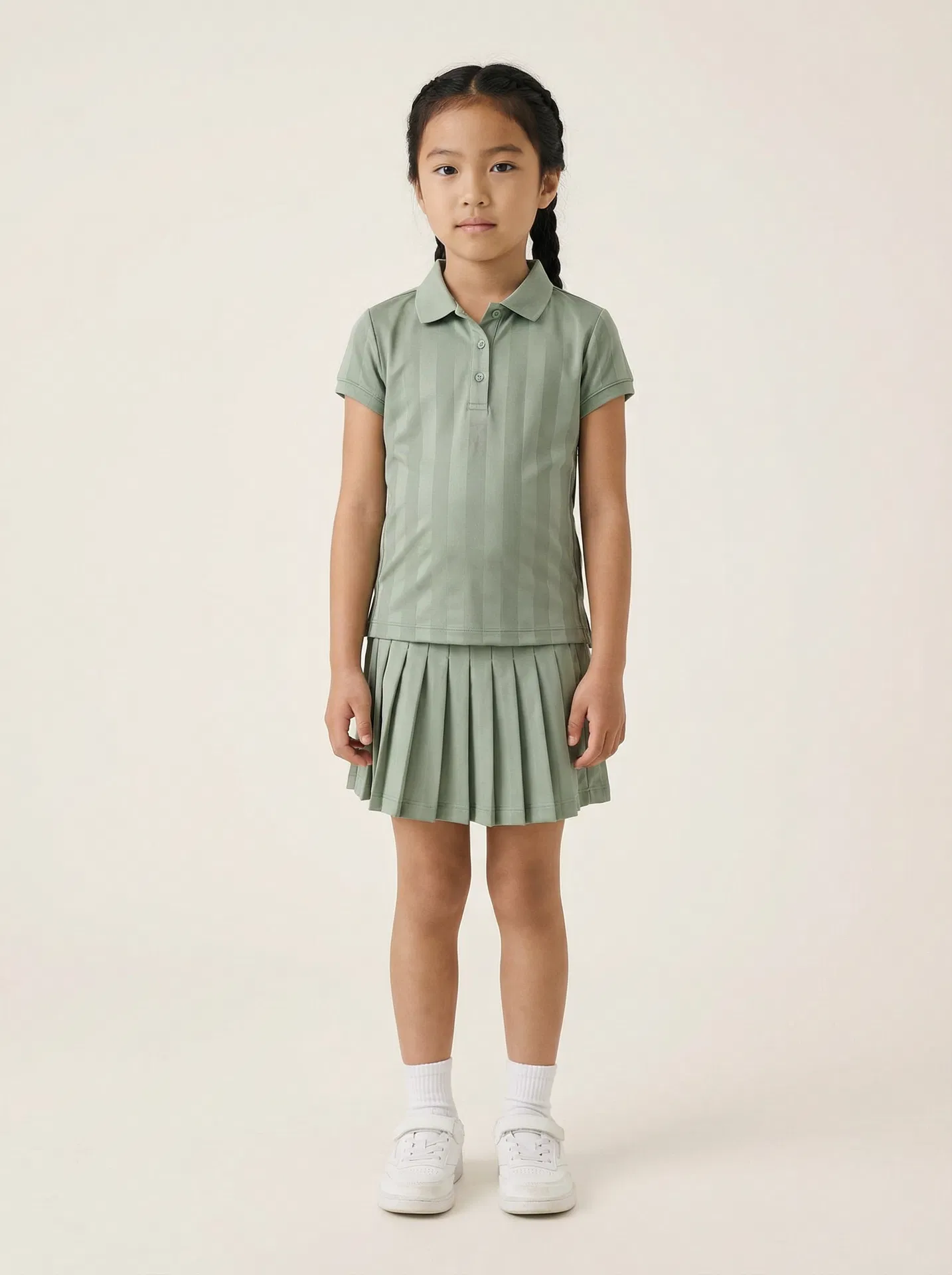 Sage green polo dress with a pleated A-line skirt and ivory contrast collar. Soft, refined, and built for the court. The colour of garden mornings and championship afternoons.